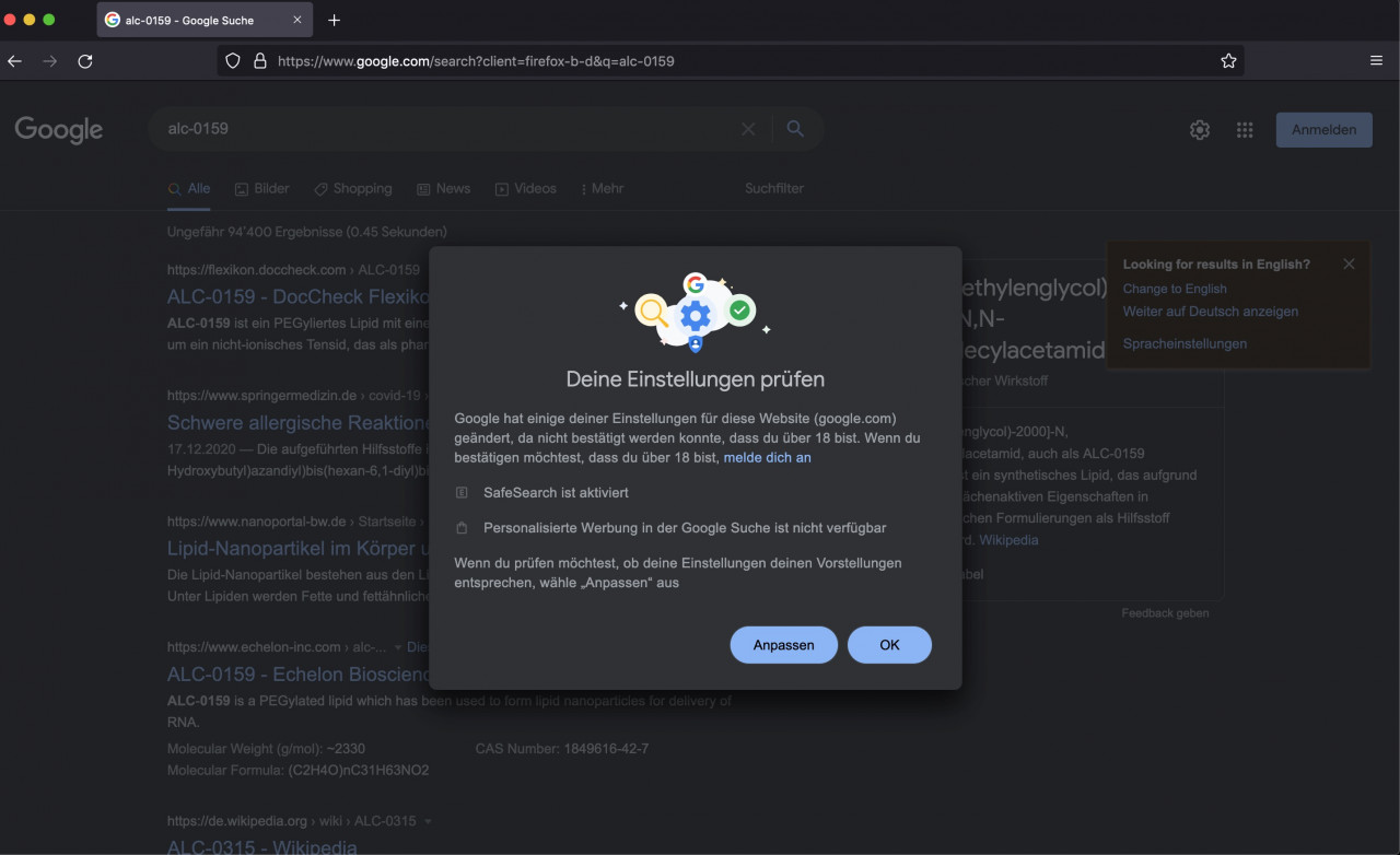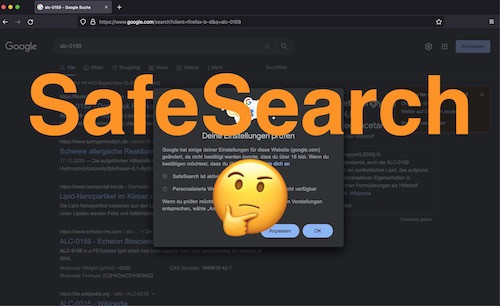 Ist es Zufall, oder nicht, dass Google mich genau bei der Suche nach "ALC-0159" (ein Inhaltsstoff vom Biontech Piks) darauf aufmerksam macht, dass meine Volljährigkeit nicht bestätigt werden konnte und mir daraufhin einfach SafeSearch aktiviert?