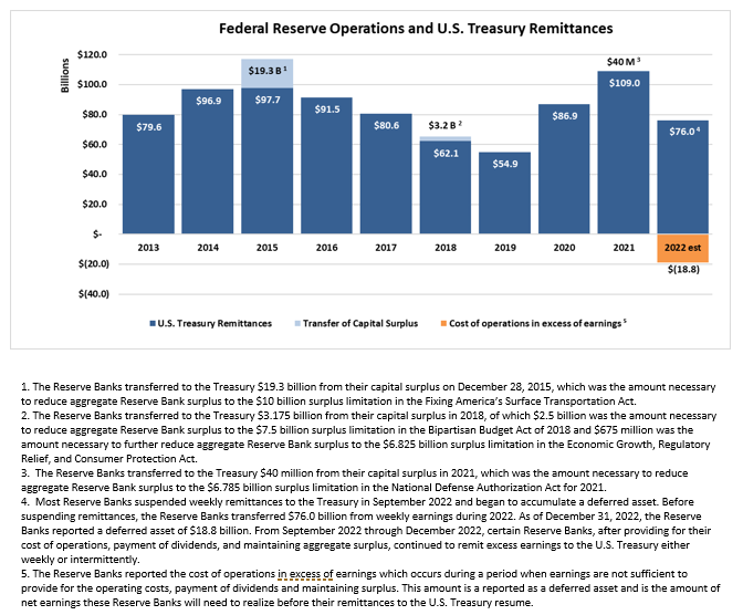 Im Laufe des Jahres 2022 überwiesen die Reserve Banks 76,0 Mrd. $ aus den wöchentlichen Erträgen an das US-Schatzamt, und im September 2022 setzten die meisten Reserve Banks die wöchentlichen Überweisungen an das Schatzamt aus und begannen mit der Bildung eines Rechnungsabgrenzungspostens, der sich bis zum Jahresende auf 18,8 Mrd. $ belief. Ein aufgeschobenes Guthaben hat keine Auswirkungen auf die Durchführung der Geldpolitik der Federal Reserve oder ihre Fähigkeit, ihre finanziellen Verpflichtungen zu erfüllen.