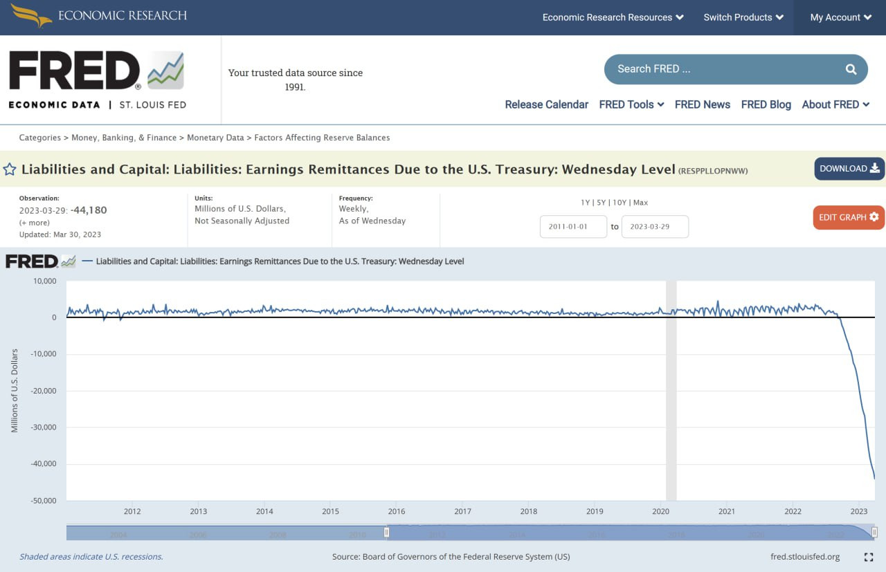 Das Treasury Department erhält kein Geld mehr von der Notenbank, denn sie hat allein in der Woche zum 29. März 2023 ein Minus von 44 Mrd. $ verbucht.
