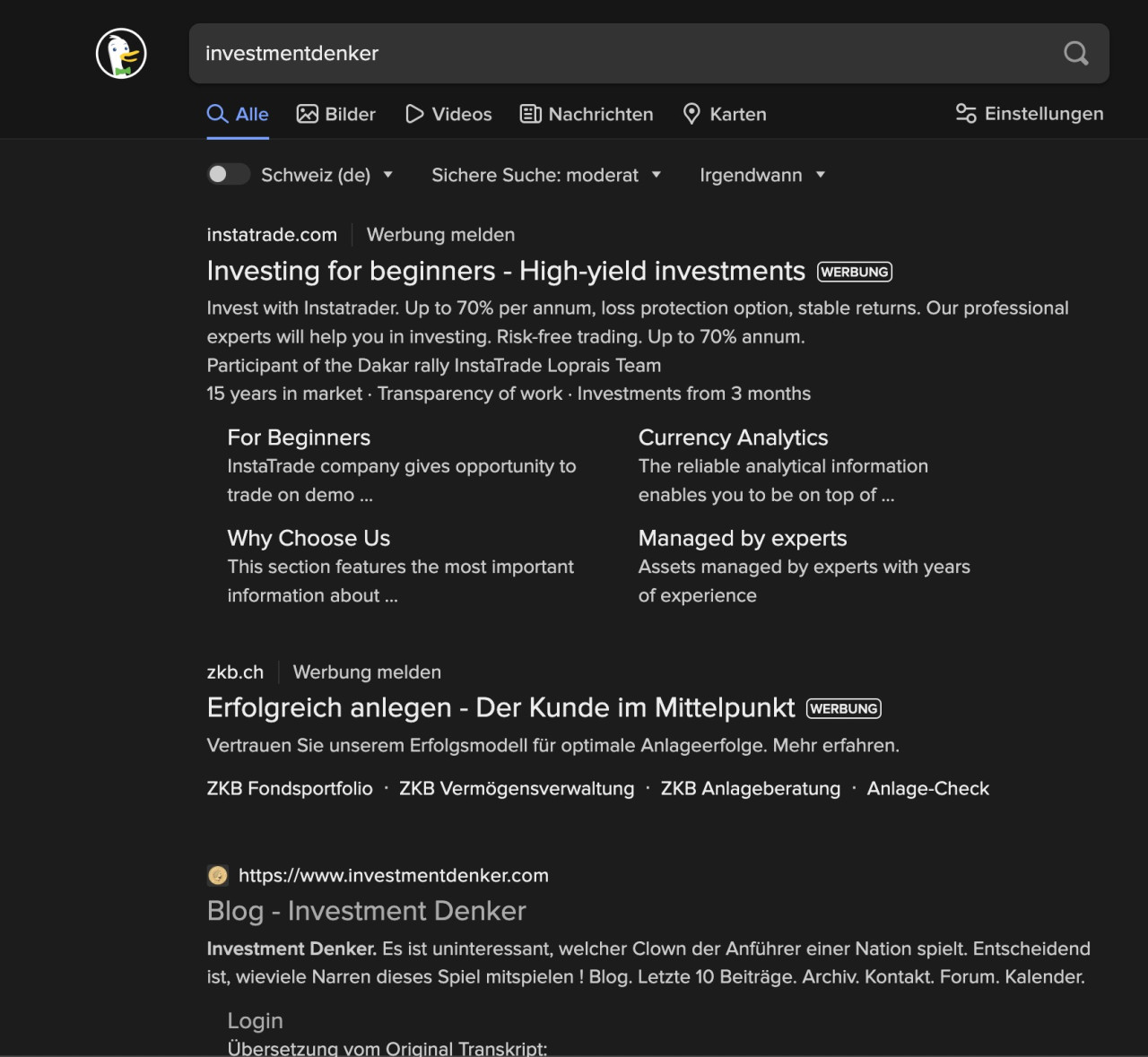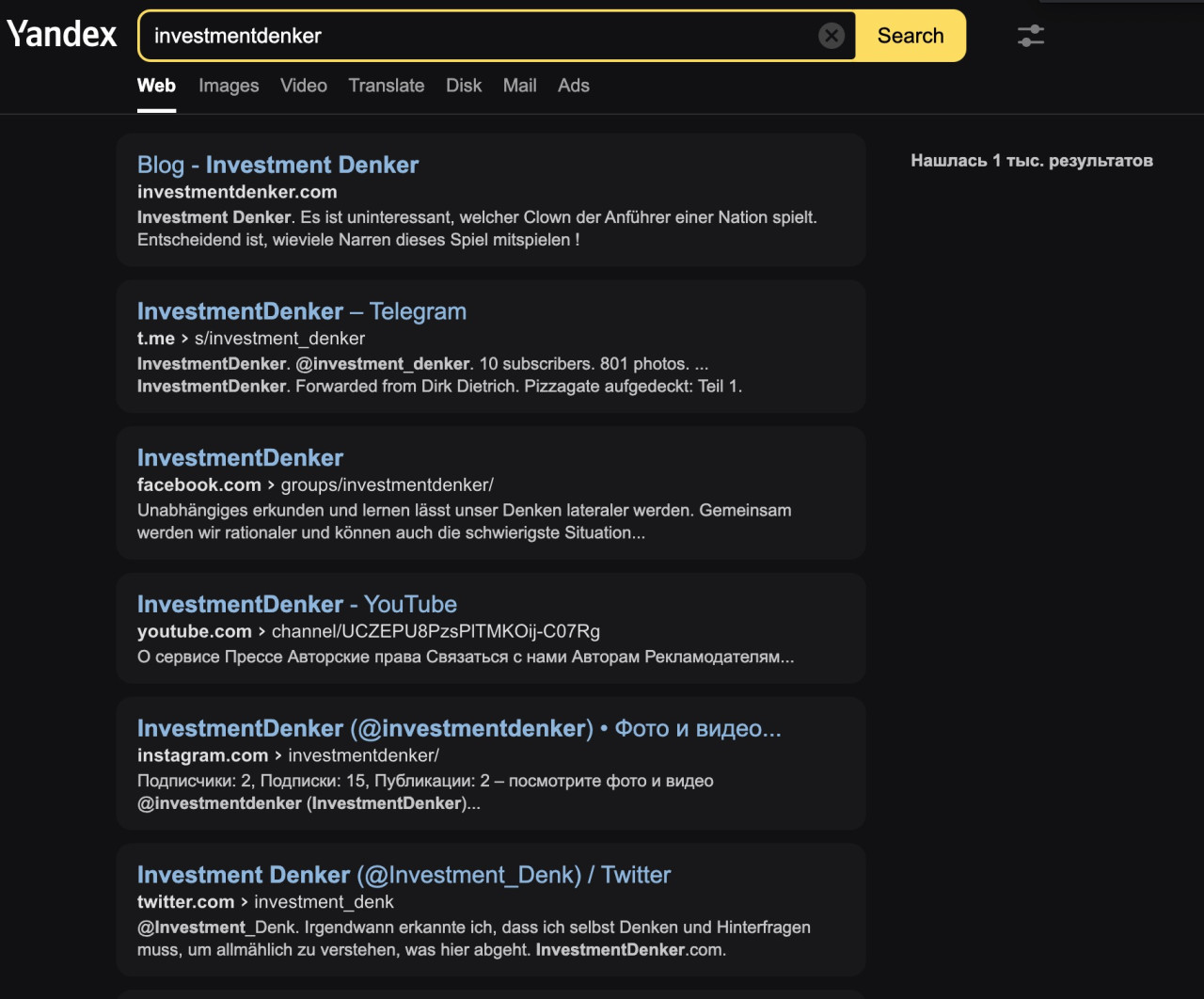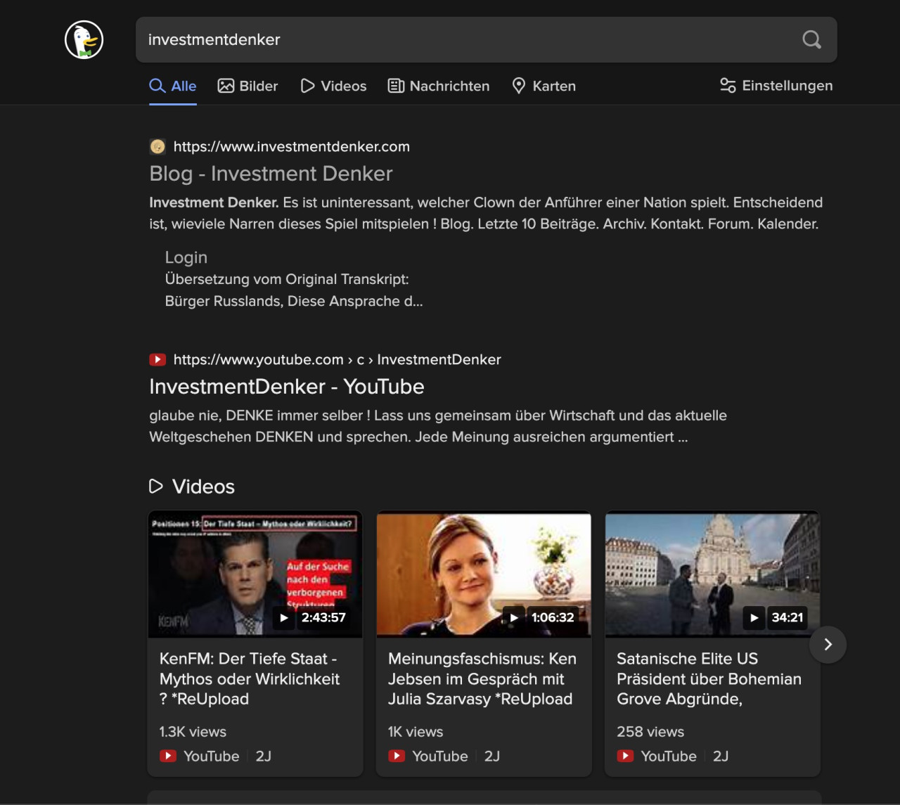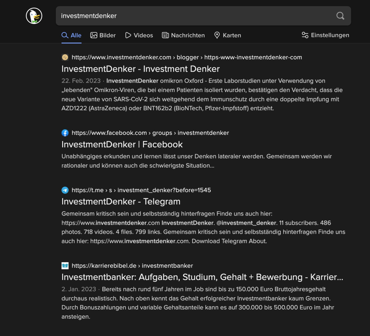 Auf Google wird unsere Website von InvestmentDenker sowie alle dazugehörigen Social Media Kanäle nirgendwo vorgeschlagen - totale Zensur. Auf DuckDuckGo und Yandex (russische Suchmaschine) findet man uns wie erwartet unter den ersten Sucheinträgen.