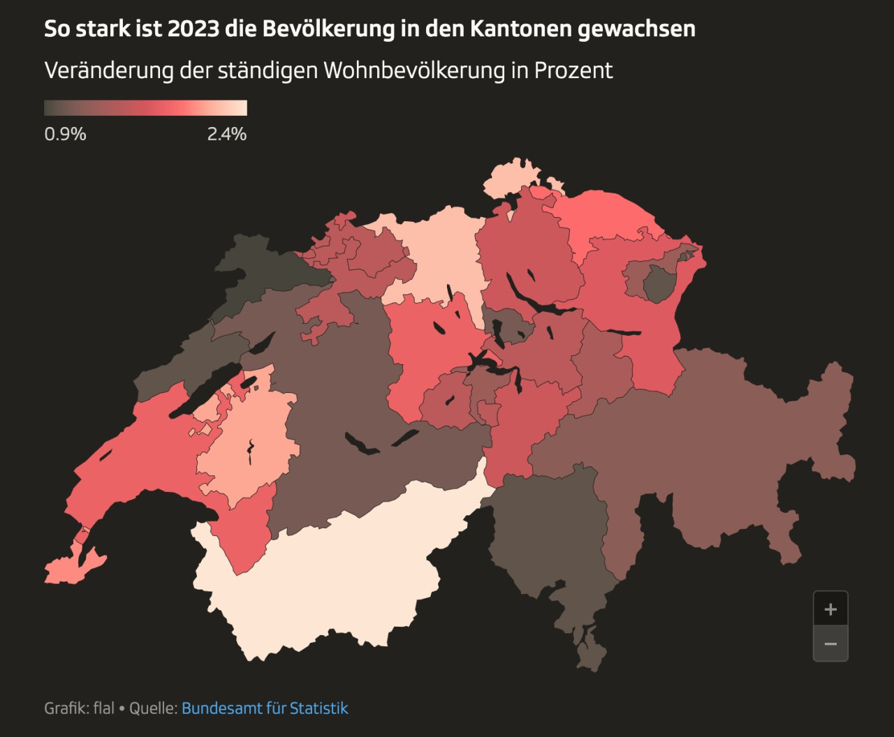 Unter dem Strich verzeichneten 2023 alle Schweizer Kantone eine Bevölkerungszunahme. Das grösste Plus verzeichneten das Wallis (2,4 Prozent) sowie Schaffhausen und Aargau mit je 2,2 Prozent. Das geringste Wachstum haben derweil die Kantone Jura (0,9 Prozent) sowie Neuenburg, Tessin und Appenzell Innerrhoden mit je 1 Prozent.