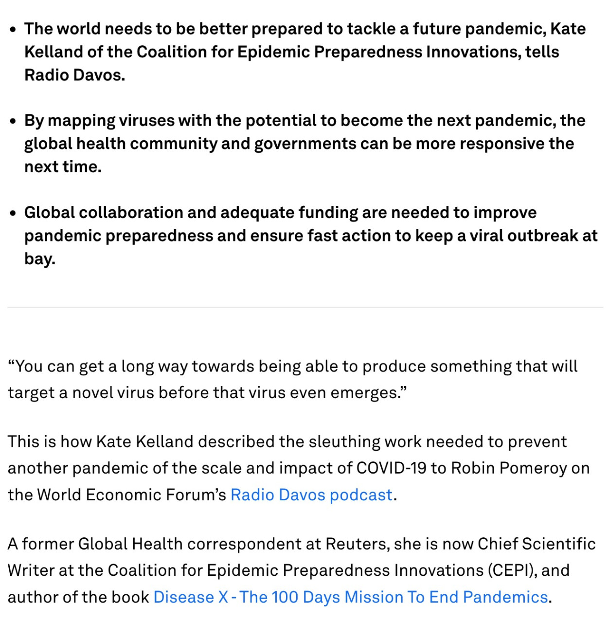 A former Global Health correspondent at Reuters, she is now Chief Scientific Writer at the Coalition for Epidemic Preparedness Innovations (CEPI), and author of the book Disease X - The 100 Days Mission To End Pandemics.